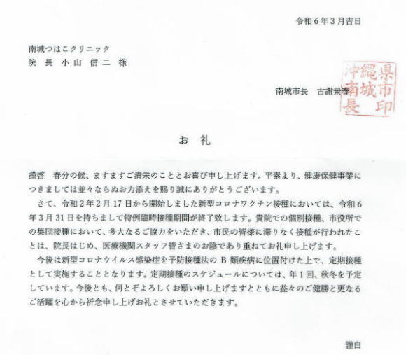 小山理事長に新型コロナワクチン接種で、南城市からお礼状