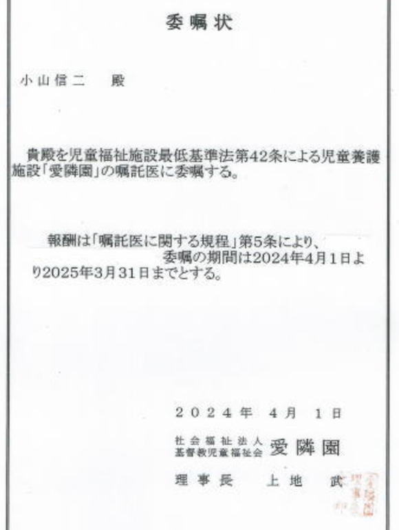 児童養護施設「愛隣園」嘱託医の委嘱書交付
